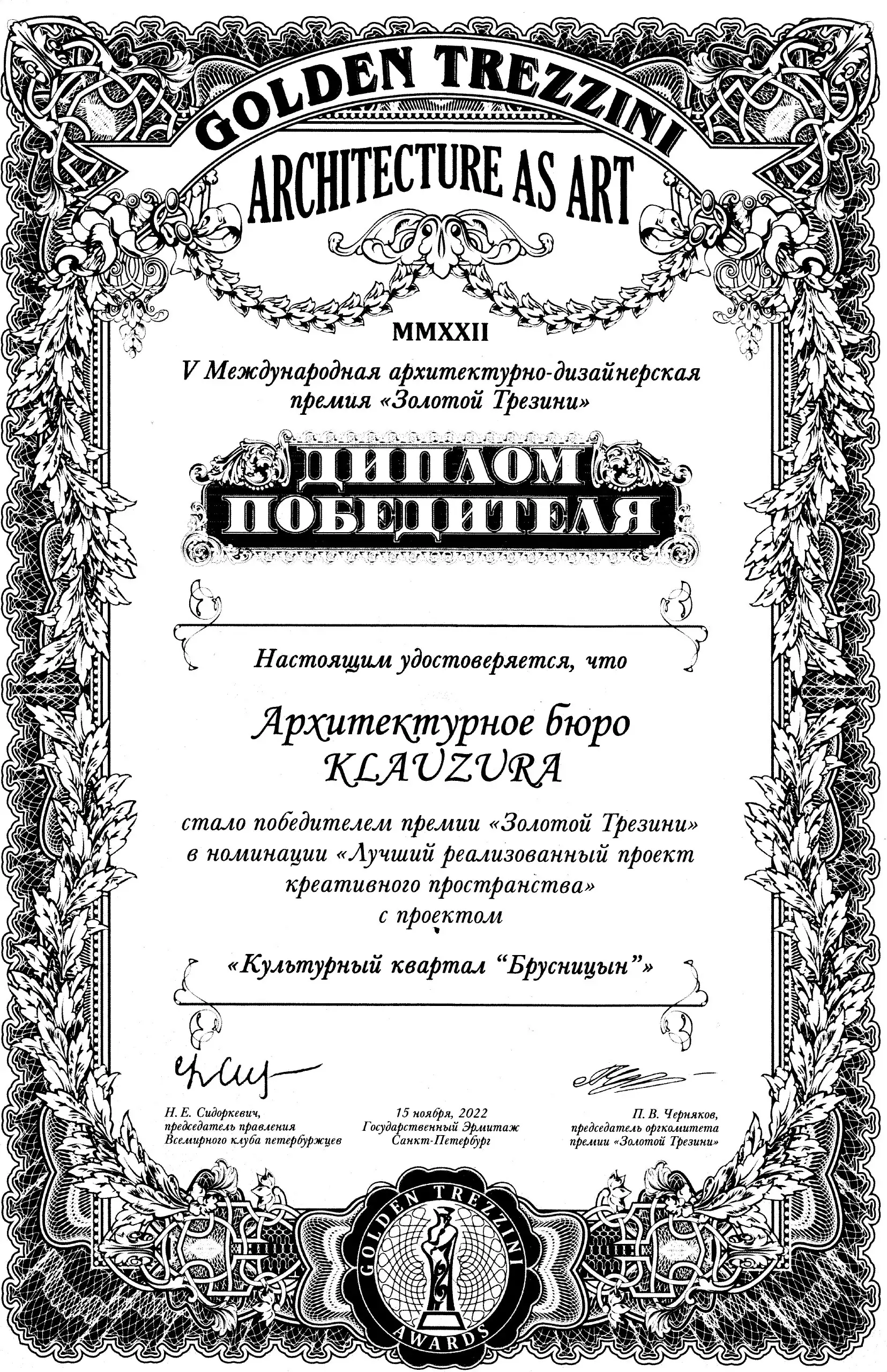 Серебрянный диплом «Золотой Трезини» 2023 г. в номинации «Лучший реализованный проект креативного пространства». Культурный квартал Брусницын