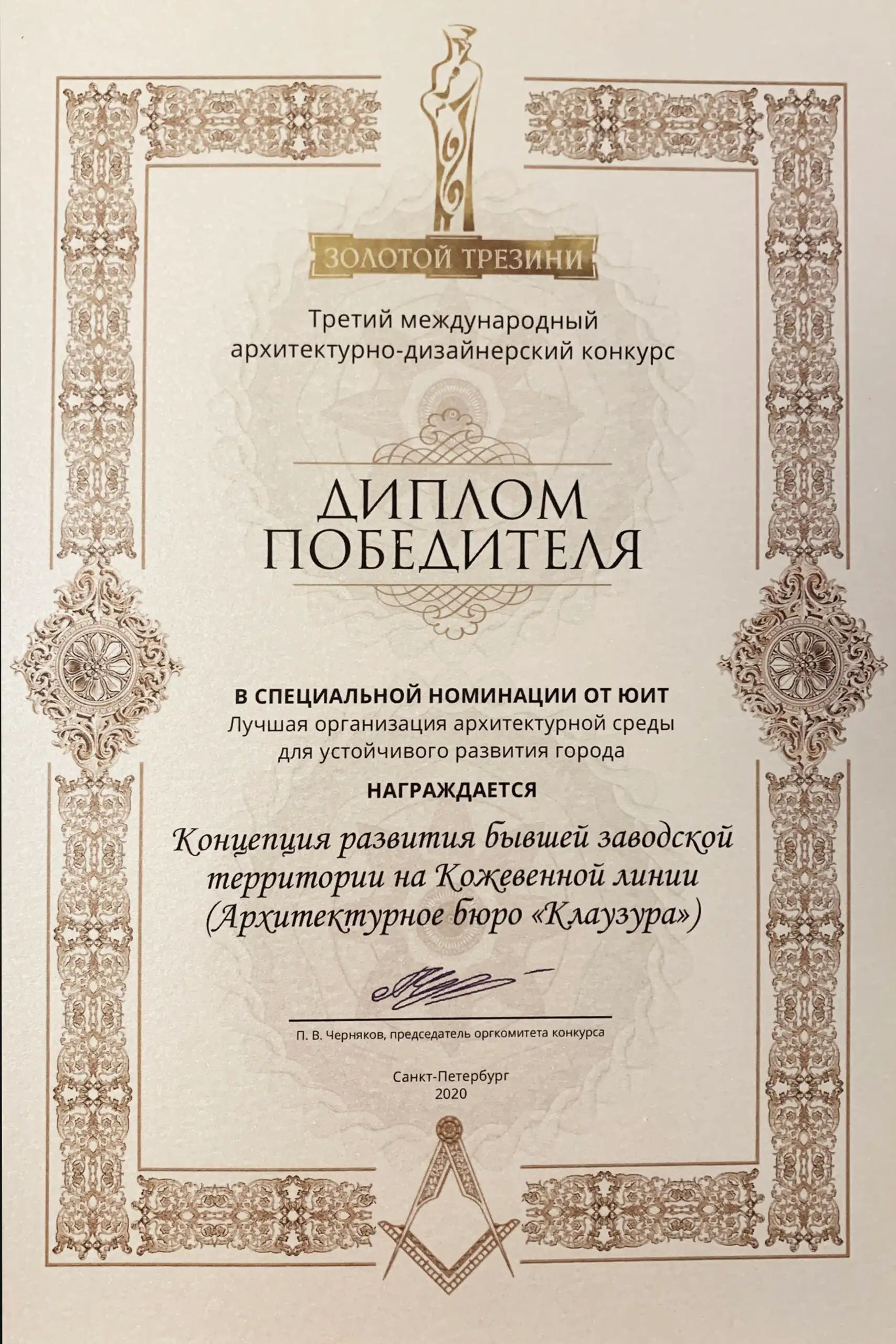 Лауреат премии «Золотой Трезини» 2020 г. в специальной номинации «Лучшая организация архитектурной среды для устойчивого развития»